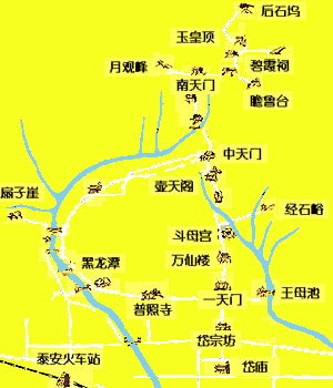 岱宗坊 - 红门(一天门) - 斗母宫 - 经石峪 - 壶天阁 - 中天门 - 十八盘 - 升仙坊 - 五大夫松 - 望人松 - 南天门 - 大观峰 - 天街 - 探海石-云海玉盘 - 日观峰