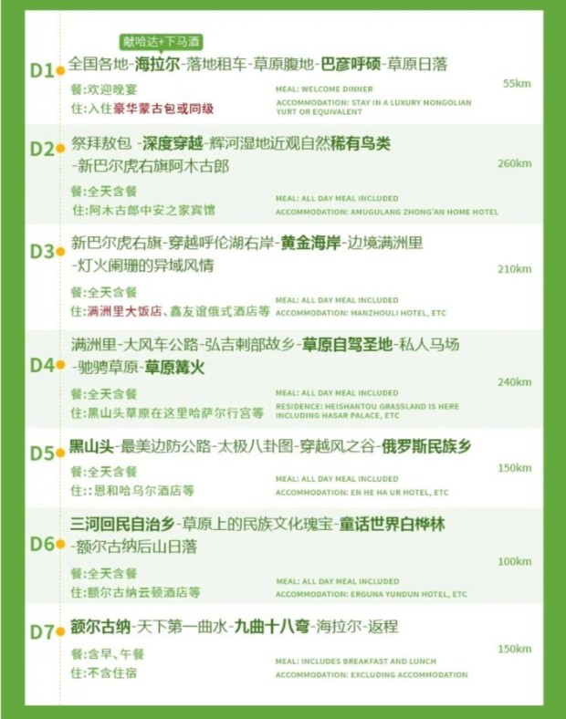 • 7、增值:24小时管家式服务,赠送航拍视频,赠送随车俄罗斯进口零食草原奶制品,赠送呼伦贝尔地区最高接机礼仪。
